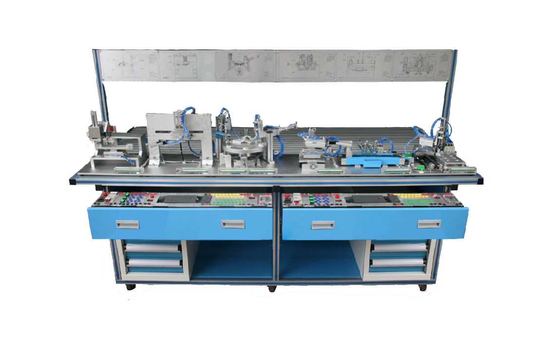 TYK-Q02 氣動(dòng)工業(yè)自動(dòng)化綜合實(shí)訓(xùn)裝置操作平臺(tái)采用創(chuàng)新式雙面設(shè)計(jì)理念。在平臺(tái)正上方設(shè)長(zhǎng)條面板,展示各種應(yīng)用回路示教圖及操作流程注意事項(xiàng)和功能模塊說明;而平臺(tái)下方為抽屜式控制系統(tǒng)安裝抽屜,需要進(jìn)行電氣控制時(shí)拉出進(jìn)行連接即可。電氣控制器采用了自主研發(fā)的超小型模塊盒組裝式,并配備有方便拆卸塑料彈卡可隨意安裝于控制抽屜;抽屜下方兩側(cè)均為一個(gè)2抽屜式零件柜,該柜體中上層為工具及資料框,下層為方格式氣動(dòng)/電氣元件放置抽屜,平臺(tái)*下方中間位空出位置用于擺放閑置的功能模塊。
