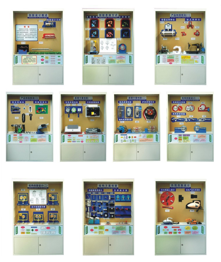 TYK-N01型《 機(jī)械創(chuàng)新設(shè)計(jì)》陳列柜是機(jī)械基礎(chǔ)實(shí)驗(yàn)中心結(jié)合國內(nèi)外*新的創(chuàng)新教析、創(chuàng)新產(chǎn)品設(shè) 計(jì)的一套內(nèi)容豐富、圖文并茂的教學(xué)展示柜。該陳列柜采用 各種國內(nèi)外設(shè)計(jì)新穎的機(jī)電產(chǎn)品或模型,配合相應(yīng)的圖文資料,介紹機(jī)械創(chuàng)新設(shè)計(jì)的基本原理與方法,對于啟迪創(chuàng)新思 維,提高機(jī)械創(chuàng)新意識與創(chuàng)新設(shè)計(jì)能力具有重要的作用。其 優(yōu)點(diǎn)是增加模型或?qū)嵨飻?shù)量,精選富有創(chuàng)造性的機(jī)電類新產(chǎn)品,圖文展示力求精煉;布局更加科學(xué)合理;解說詞更具啟發(fā)。各柜裝有語音芯片單、單片機(jī)、手動控制盒及音箱,另配紅外線遙控器,用來控制模型的動作和播音,使模型動作 與講解的控制方式理加方便靈活。是理工科院校創(chuàng)建“創(chuàng)新 教育基地”或“創(chuàng)新設(shè)計(jì)實(shí)驗(yàn)室”不可缺少的教學(xué)設(shè)備。