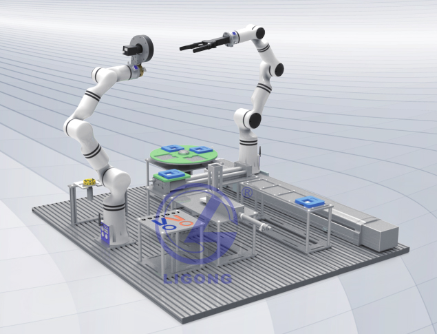 ★1、機械臂:平臺上安裝有兩臺輕量化機械臂。一臺固定安裝并配有工業(yè)相機,用以物料識別與定位。一臺安裝在移動導軌之上,用來進行產品托盤的出入庫。