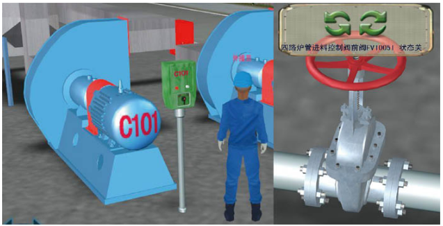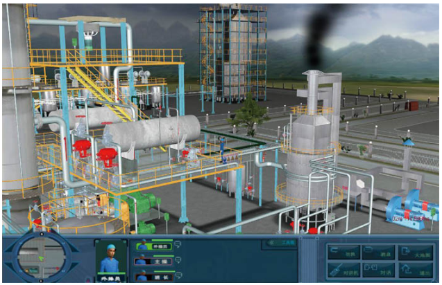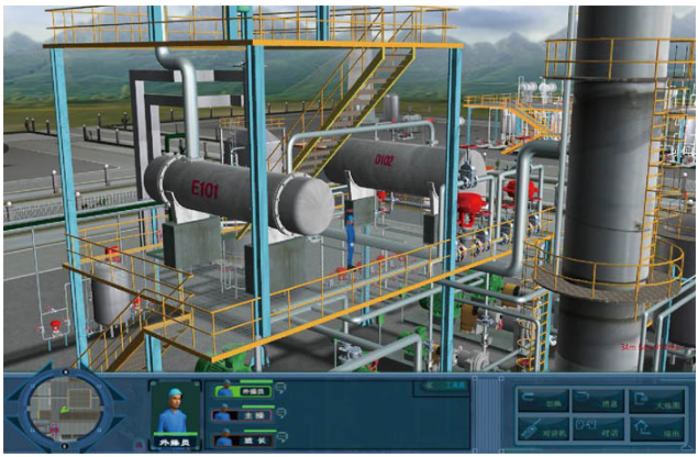 按實際現(xiàn)場設(shè)備的外形、尺寸、顏色、位置關(guān)系及距離、管線連接方式、音響效果等物理屬性建立3D場景和設(shè)施,包括防火堤、滅火器、消防水炮等各種安全設(shè)施。