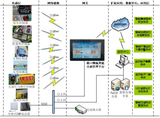 倉儲(chǔ)物流交通實(shí)訓(xùn)系統(tǒng)覆蓋物聯(lián)網(wǎng)的傳感層、網(wǎng)絡(luò)鏈路層、網(wǎng)關(guān)、以及應(yīng)用層。智能網(wǎng)關(guān)是整個(gè)系統(tǒng)的核心,是連接傳感層與應(yīng)用層的橋梁。系統(tǒng)拓?fù)淙鐖D所示。