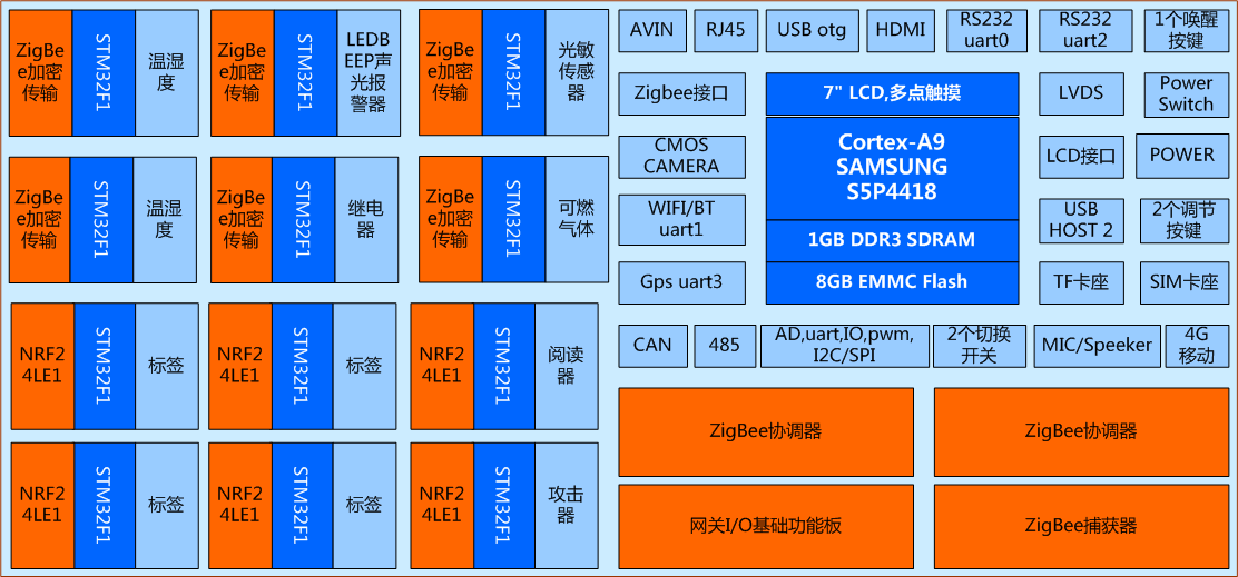 (2)物聯(lián)網(wǎng)網(wǎng)關(guān)≥1個(gè):主芯片:采用S5P4418 Cortex-A9高性能處理器,可插接通訊模塊:ZigBee 2.4GHz,WIFI/BLuetooth二合一模塊、GPS定位模塊、4G移動(dòng)通信模塊等。外設(shè)接口包括:以太網(wǎng)、串口、485、CAN、USB、USB otg、攝像頭、TF卡槽、模擬攝像頭TV、HDMI、按鍵等。