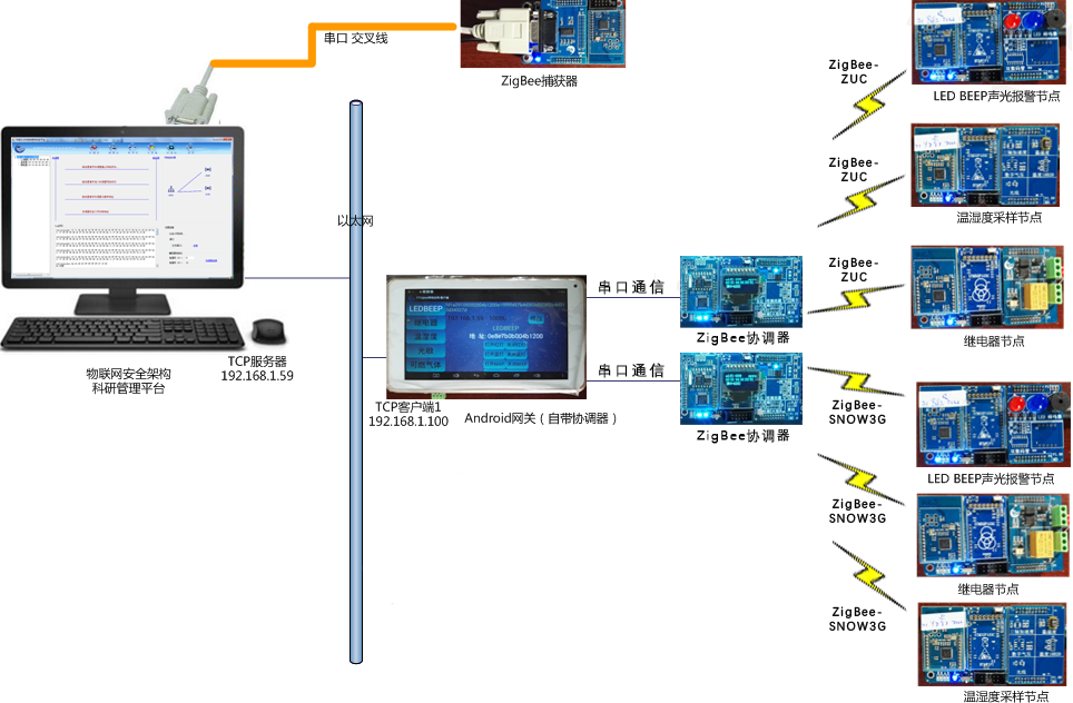包含2組ZigBee自組網(wǎng)絡(luò)。ZigBee傳感器節(jié)點(diǎn)與協(xié)調(diào)器之間可配置為加密數(shù)據(jù)傳輸,加密類型支持ZUC、snow3G、Lblock、kasumi、AES五種輕量級(jí)加密算法。ZigBee協(xié)調(diào)器支持白名單入網(wǎng)保障機(jī)制,根據(jù)申請(qǐng)入網(wǎng)設(shè)備的MAC地址識(shí)別并判斷該節(jié)點(diǎn)是否合法,從而做出允許或拒絕入網(wǎng)的動(dòng)作。Android網(wǎng)關(guān)采用TCP協(xié)議與PC服務(wù)器通信,實(shí)時(shí)接收Z(yǔ)igBee協(xié)調(diào)器解密后的傳感層數(shù)據(jù),內(nèi)嵌五種加密類型,支持靈活配置,將傳感層數(shù)據(jù)經(jīng)過解析、重組,加密傳輸至PC端服務(wù)器信息平臺(tái)。服務(wù)器軟件平臺(tái)通過捕獲器捕獲傳感網(wǎng)幀,以流程條方式動(dòng)態(tài)展示傳感層認(rèn)證步驟,顯示繪制網(wǎng)絡(luò)拓?fù)浣Y(jié)構(gòu),MAC/NWK/APS數(shù)據(jù)幀詳細(xì)數(shù)據(jù),支持五種輕量級(jí)算法的加解密,分析數(shù)據(jù)幀的加密類型,統(tǒng)計(jì)加密算法的效率、列表顯示設(shè)備狀態(tài)、遠(yuǎn)程監(jiān)測(cè)與控制傳感器設(shè)備等。技術(shù)架構(gòu)如圖所示: