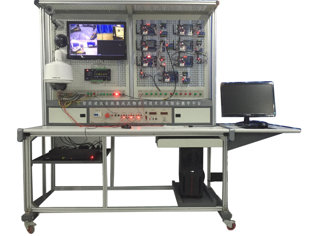 一、?基本要求 ? ? ? ? ?該系統(tǒng)集成當(dāng)前智能家居嵌入式設(shè)計和物聯(lián)網(wǎng)技術(shù)。要能滿足電子信息工程、電氣自動化等相關(guān)專業(yè)學(xué)生進行智能家居應(yīng)用和物聯(lián)網(wǎng)技術(shù)開發(fā)的學(xué)習(xí)及研究。要能夠展示智能家居系統(tǒng)的工作原理,物聯(lián)網(wǎng)技術(shù)在多個領(lǐng)域的典型應(yīng)用。 ? 二、?技術(shù)參數(shù)要求 1.?輸入電源要求:單相三線220V±10% 50Hz ?? 2.?工作環(huán)境要求:溫度-10℃~+40℃ 相對濕度<85%(25℃) 海拔<4000m 3.?裝置容量要求:≤0.6KVA 4.?外形尺寸要求:2040mm×720mm×1760mm 5.?安全保護要求:具有漏電自動保護裝置,符合國家標(biāo)準(zhǔn)。 三、?配置及功能要求 ? ? ? ? 實驗臺架的框架必須采用鋁合金型材組成,實驗桌為鐵質(zhì)雙層亞光密紋噴塑結(jié)構(gòu),桌面為防火、防水、耐磨高密度板,結(jié)構(gòu)堅固,造型美觀大方;實驗桌還設(shè)有四個萬向輪和四個固定調(diào)節(jié)機構(gòu),便于移動和固定平臺帶有漏電保護裝置、急停開關(guān);提供AC220V交流電源接口,可為外配儀器設(shè)備提供工作電源;配有一組DC 0~30V/2A連續(xù)可調(diào)直流電源;帶有數(shù)字電壓、電流表;直流穩(wěn)壓電源:提供+5V、+12V、+24V...