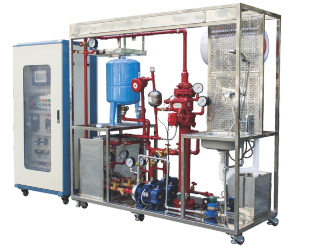 消防給水系統(tǒng)主要由給水箱、噴淋泵、氣壓罐、濕式報警閥、壓力開關(guān)、水流指示器、消防給水管道、閉式噴淋頭等組成。管路采用鍍鋅管進行設(shè)計,可進行鍍鋅管的切割、套絲、安裝和通水試驗操作,通過控制系統(tǒng)可實現(xiàn)噴淋滅火功能。