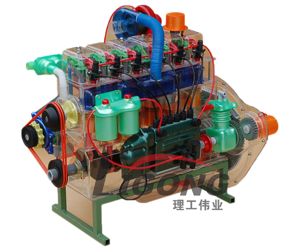 透明發(fā)動機模型外殼選用透明有機玻璃制作,內(nèi)部部件均以硬質(zhì)塑料料加工,用螺絲固定在金屬高溫烘漆而成的鐵架子上??偝刹糠侄家詨耗3尚渭庸?,代替過去膠粘合的方法,使產(chǎn)品在強度上有很大提高。發(fā)動機總成模型用直流電機驅(qū)動,能演示發(fā)動機內(nèi)部曲軸、活塞、氣門等運行情況,點火系統(tǒng)采用燈光演示,能根據(jù)實際發(fā)動機運行時的點火順序進行演示。