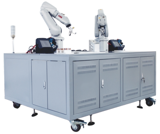 隨著現代制造業(yè)和服務業(yè)的轉型升級,工業(yè)機器人在測量檢驗、包裝、分揀處理、搬運、碼垛、填裝、機器上下料、裝配、金屬切割、焊接、噴涂等領域得到了越來越多的應用。在不同領域的應用會對機器人的安裝、編程、調試人員提出了不同的要求。根據現實工業(yè)情況,設計研發(fā)了LGY-JQ05A型工業(yè)機器人實訓考核裝備(鼠標裝配)??蓪o線鼠標的散件(無線接收器,電池,后蓋,底板),通過兩個ABB機器人的協作,將無線鼠標裝配完成。