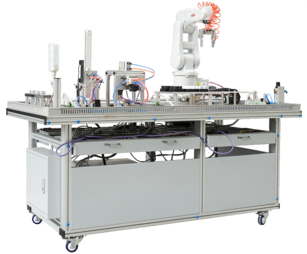LGY-JY011A型智能制造工作站實訓(xùn)設(shè)備主要由安裝在鋁合金導(dǎo)軌式實訓(xùn)臺上的送料單元、加工單元、軌跡單元、搬運單元和碼垛單元5個單元組成。電氣布局采用雙抽屜式,所有其電氣控制器都安裝在網(wǎng)孔板式的抽屜上,這種機電分離的格式跟加符合了工業(yè)實際情況,在控制方面,該設(shè)備配置采用了基于RS485串行通信的PLC網(wǎng)絡(luò)控制方案,各PLC之間通過RS485串行通訊實現(xiàn)互連的分布式控制方式,外觀如上圖所示。該設(shè)備涵蓋了機電一體化或電氣自動化專業(yè)學(xué)習(xí)中所涉及的如工業(yè)機器人應(yīng)用與維護、機電控制技術(shù)、氣動控制技術(shù)、過程控制技術(shù)、可編程控制技術(shù)、自動檢測技術(shù)、運動控制技術(shù)、網(wǎng)絡(luò)通信技術(shù)、人機界面等多項技術(shù),具有職業(yè)性、實踐性、開放性、產(chǎn)業(yè)性、教學(xué)性、通用性等特點,是一套能用于職業(yè)技能的訓(xùn)練、培訓(xùn)、考核及技能大賽的實訓(xùn)設(shè)備。