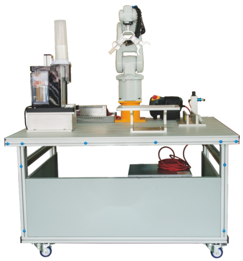 本裝置按照工業(yè)標(biāo)準(zhǔn)制造,符合自動化技術(shù)要求,能完成機(jī)器人取杯、接水(接咖啡)、取茶包、泡茶、加糖一系列動作。為保證教學(xué)安全,桌面配置有急停按鈕,防止人員意外接近運(yùn)動中的機(jī)器人而造成意外傷害,既可保證教學(xué)和展示過程中的透明,可近距離觀察設(shè)備運(yùn)行又保證人員安全,為教學(xué)和展示安全做出保障。