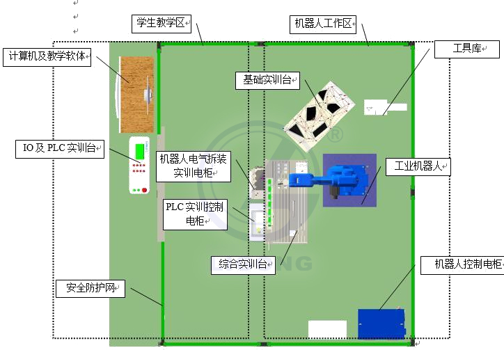 ? ? LGH-JR12型?工業(yè)機(jī)器人綜合教學(xué)實(shí)訓(xùn)平臺(tái)整體占地尺寸為 4000mm*4000mm*1500mm(詳見(jiàn)下圖)。工作站含 LG-ZN612型工業(yè)機(jī)器人及其控制柜 1 套、基礎(chǔ)實(shí)訓(xùn)臺(tái) 1 套、綜合實(shí)訓(xùn)臺(tái) 1 套、IO 及 PLC 操作臺(tái) 1 套、安全防護(hù)設(shè)施 1 套、電腦及電腦桌椅(選配)等。