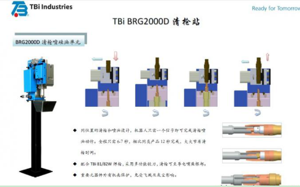 (1)德國(guó)TBi BRG-2000D清槍剪絲機(jī)構(gòu)同位置的清槍和噴油設(shè)計(jì),機(jī)器人只需要一個(gè)信號(hào)就可以完成清槍噴油動(dòng)作。